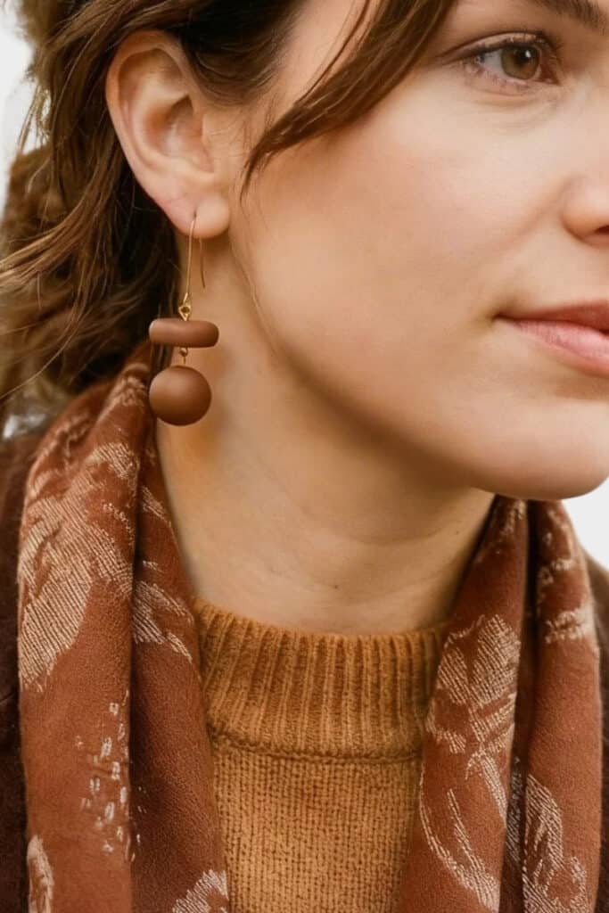 “I love the geometric shape of these beaded earrings in brown. They go so well with a brown monochrome outfit or any look centered around earth tones.”