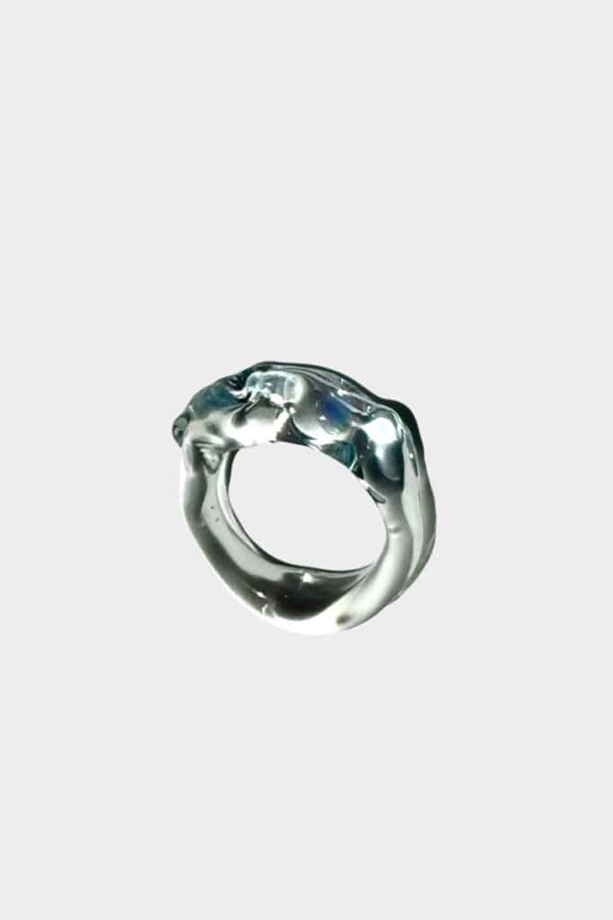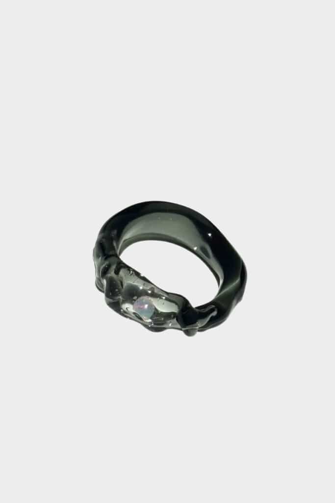 “This ring features that same opal-in-glass technique as the other glass ring but in a dark gray, smoky glass. The way the dark transparency sits against the skin is stunning.”