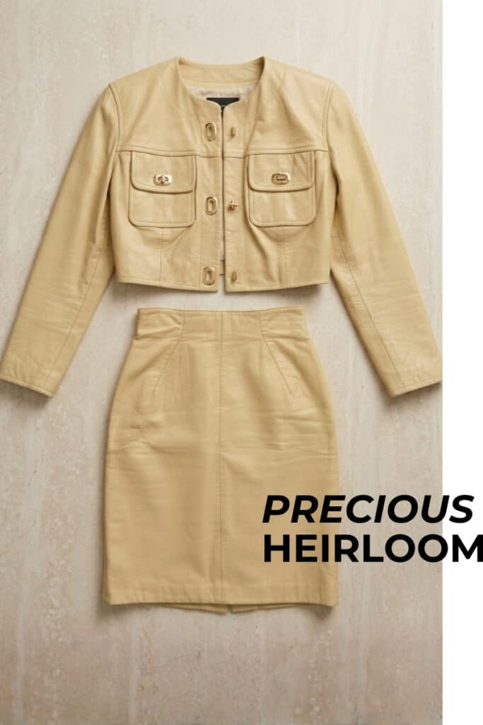 “This Michael Hoban leather set I inherited from my mother features a butter cream cropped jacket and pencil skirt with gold hardware. This set has survived decades and is more relevant than ever. Vintage that doesn’t feel vintage.”