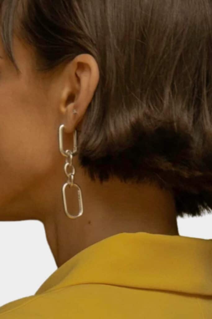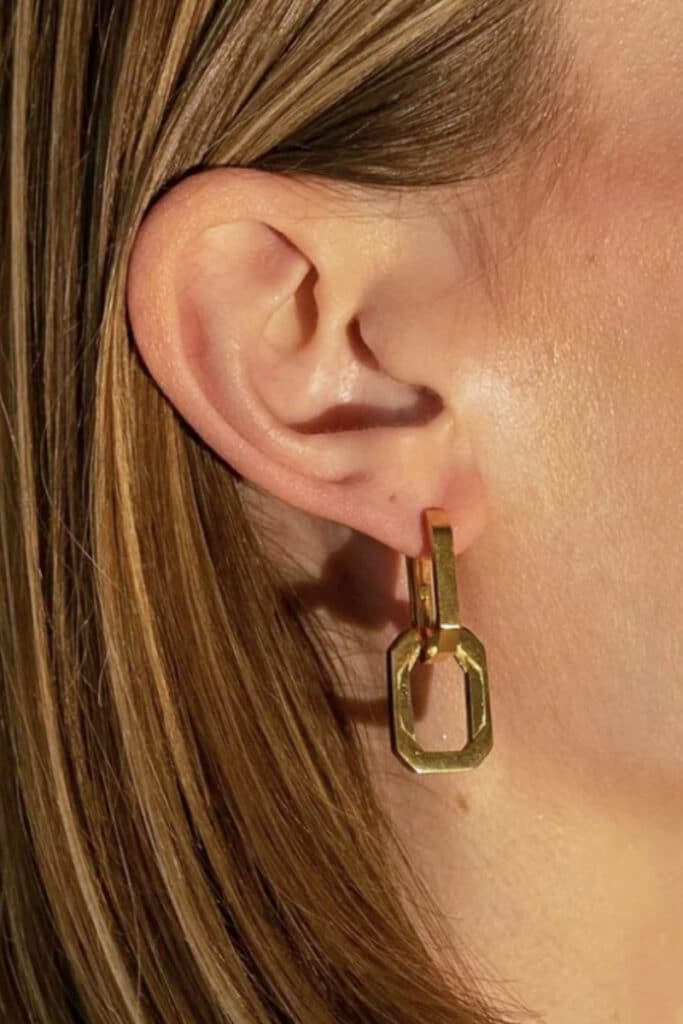 “I love our geo hoops for their convertible design. You can wear them fully assembled as a dramatic, double-link statement, or simply detach the bottom link for a sleek, minimalist single hoop that’s great for everyday.”